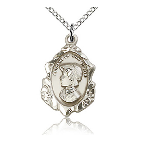 This silver St. Elizabeth shield necklace is die struck, hand-engraved medal. Inscription: SAINT ELIZABETH PRAY FOR US. Free 18-inch sterling silver lite curb chain with lobster clasp. Dimensions: 3/4in x 1/2in. This item is the size of a penny. Made in USA.