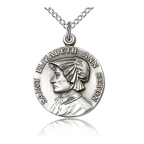 This silver St. Elizabeth Ann Seton necklace is die struck and hand-engraved. Inscription: SAINT ELIZABETH PRAY FOR US. Free 18-inch sterling silver lite curb chain with lobster clasp. Dimensions: 3/4in x 5/8in. This item is the size of a penny. Made in USA.