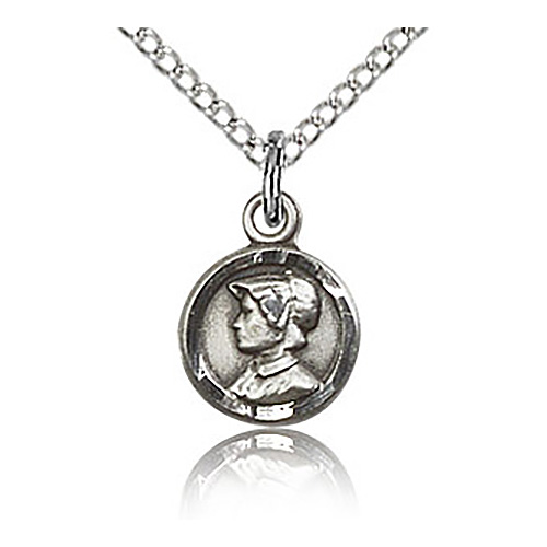 This tiny hand-engraved St Elizabeth charm hangs from a 18-inch sterling silver lite curb chain with lobster clasp. Plain back. Dimensions: 3/8in x 1/4in. This item is half the size of a penny. Made in USA.