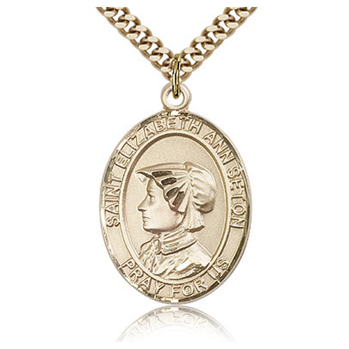 This men's gold filled St. Elizabeth necklace is die struck and hand-engraved. Inscription: SAINT ELIZABETH PRAY FOR US. 24-inch stainless steel, endless heavy curb chain with gold plating. Pendant size: 1in x 3/4in. This item is the size of a quarter. Made in USA.