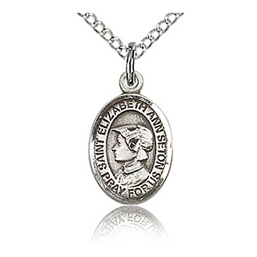 This small oval St Elizabeth charm is made of sterling silver. 18-inch sterling silver lite curb chain with lobster clasp. Plain back. Dimensions: 1/2in x 1/4in. This item is half the height of a quarter. Die struck, hand-engraved. Made in USA.