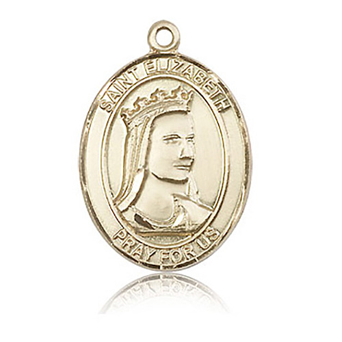 Die struck, hand-engraved St Elizabeth medal is made of polished, solid 14kt yellow gold. Inscription: SAINT ELIZABETH PRAY FOR US. Dimensions: 1in x 3/4in. This item is the size of a quarter. Made in USA.