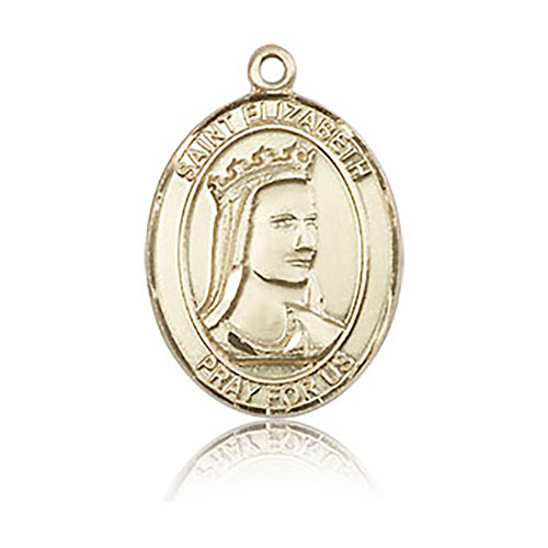 This oval St Elizabeth medal is made of polished solid 14kt yellow gold. Inscription: SAINT ELIZABETH PRAY FOR US. Dimensions: 3/4in x 1/2in. This item is the size of a penny. Die struck, hand-engraved. Made in USA.