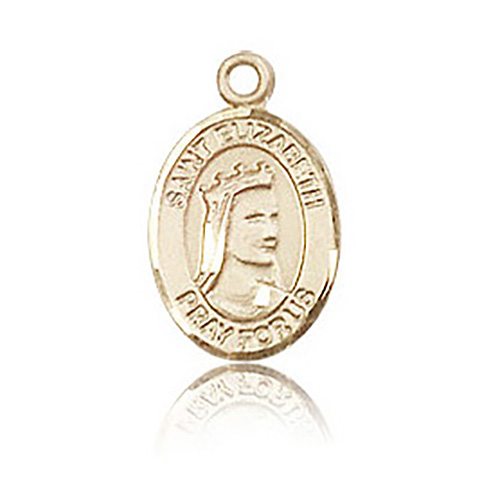 This 1/2 inch St. Elizabeth medal is die struck gold and hand-engraved. The medal is made of polished, solid 14kt yellow gold. Inscription: SAINT ELIZABETH PRAY FOR US. Dimensions: 1/2in x 1/4in. This item is half the height of a quarter. Made in USA.