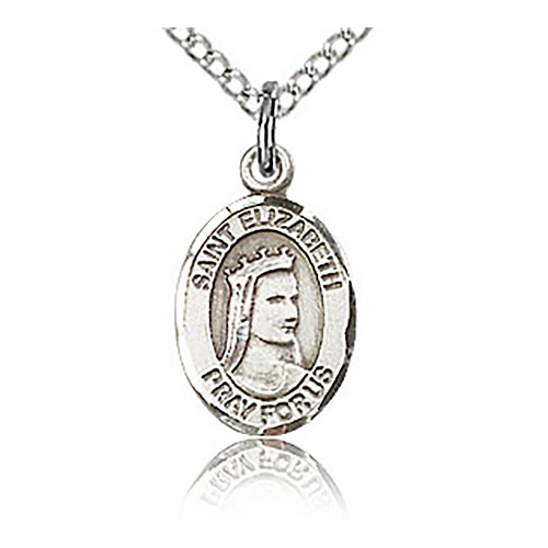 This very small oval St Elizabeth of Hungary charm is made of sterling silver. 18-inch sterling silver lite curb chain with lobster clasp. Plain back. Dimensions: 1/2in x 1/4in. This item is half the height of a quarter. Die struck, hand-engraved. Made in USA.