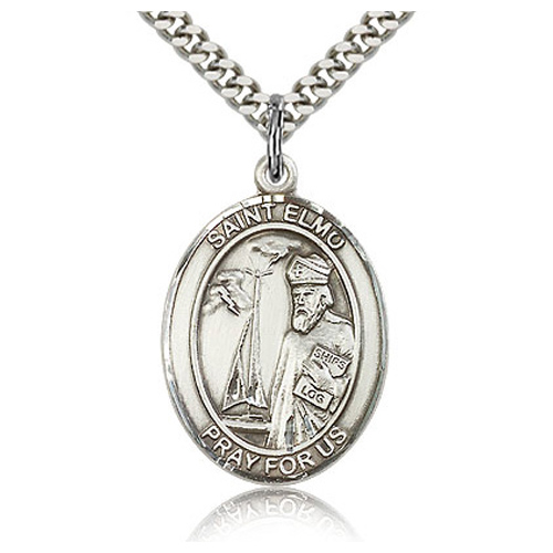 Sterling silver 1in oval St Elmo medal dangles from a 24-inch stainless steel, endless heavy curb chain with silver plating. Dimensions: 1in x 3/4in. This item is the size of a quarter. Die struck, hand-engraved. SAINT ELMO PRAY FOR US. Made in USA.