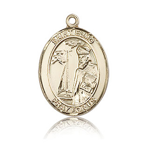 Die struck, hand-engraved medal is made of polished, solid 14kt yellow gold. Inscription: SAINT ELMO PRAY FOR US. Dimensions: 3/4in x 1/2in. This item is the size of a penny. Made in USA.