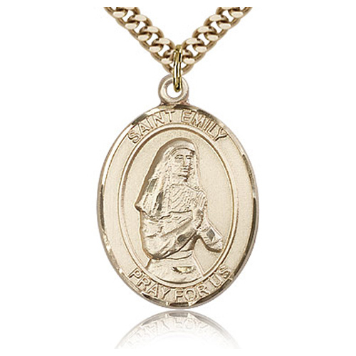 Die struck, hand-engraved medal. Inscription: SAINT EMILY PRAY FOR US. Free 24-inch stainless steel, endless heavy curb chain with gold plating. Dimensions: 1in x 3/4in. This item is the size of a quarter. Made in USA.