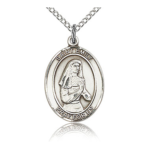 This sterling silver oval St Emily medal dangles from a sterling silver 18in lite curb chain with lobster clasp. Dimensions: 3/4in x 1/2in. This item is the size of a penny. Die struck, hand-engraved. Inscription: SAINT EMILY PRAY FOR US. Made in USA.