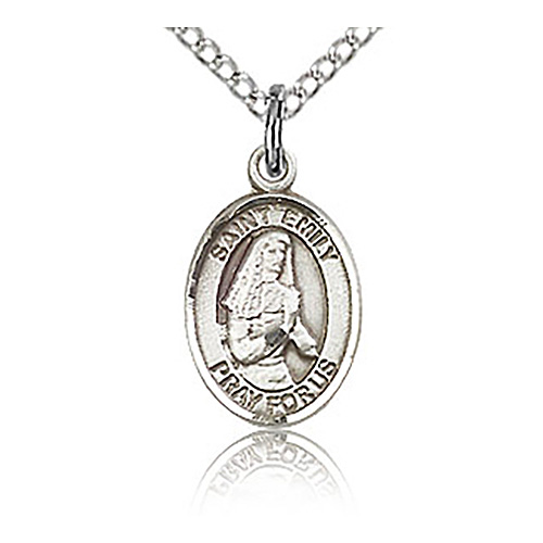 This small sterling silver St Emily charm dangles from a sterling silver 18in lite curb chain with lobster clasp. Plain back. Dimensions: 1/2in x 1/4in. This item is half the height of a quarter. Made in USA. Die struck, hand-engraved.