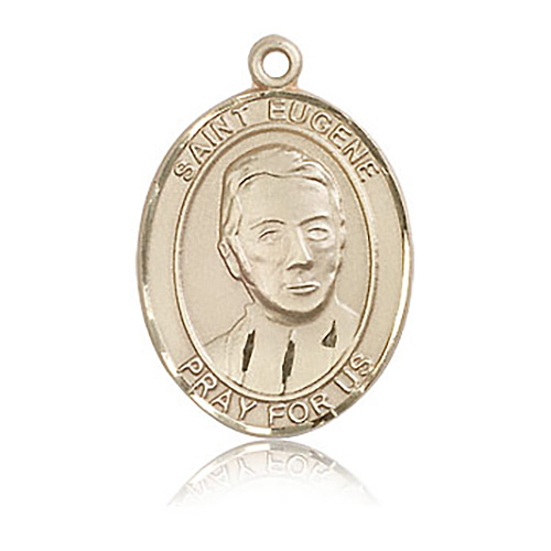 Die struck, hand-engraved medal is made of polished, solid 14kt yellow gold. Inscription: SAINT EUGENE PRAY FOR US. Dimensions: 1in x 3/4in. This item is the size of a quarter. Made in USA.