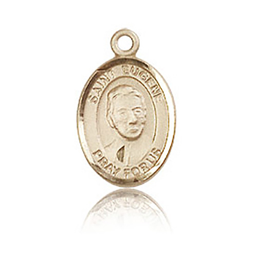 This very small St Eugene medal is made of polished, solid 14kt yellow gold. Inscription: SAINT EUGENE PRAY FOR US. Dimensions: 1/2in x 1/4in. This item is half the size of a quarter. Die struck, hand-engraved. Made in USA.