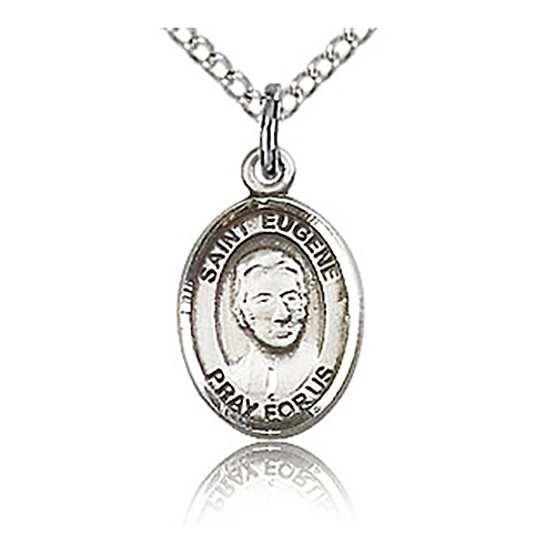 This very small St Eugene charm is made of sterling silver. 18-inch sterling silver lite curb chain with lobster clasp. Plain back. Dimensions: 1/2in x 1/4in. This item is half the height of a quarter. Die struck, hand-engraved. Made in USA.