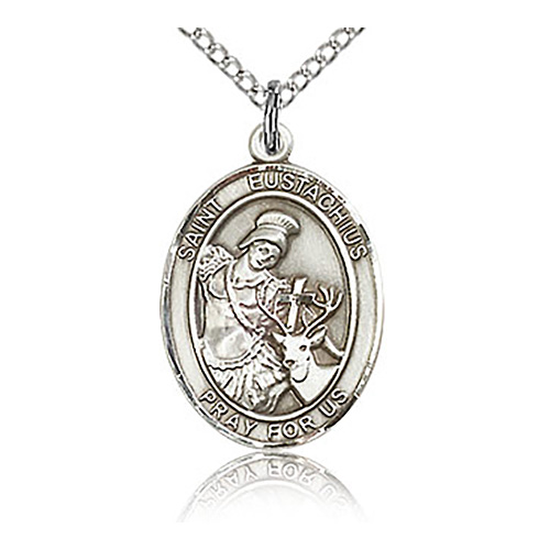 St Eustachian medal is die struck and hand-engraved. Inscription: SAINT EUSTACHIUS PRAY FOR US. 18-inch sterling silver lite curb chain with lobster clasp. Dimensions: 3/4in x 1/2in. This item is the size of a penny. Made in USA.