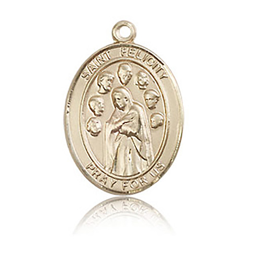This ladies' 14k yellow gold oval St Felicity medal is die struck and hand-engraved. Inscription: SAINT FELICITY PRAY FOR US. Dimensions: 3/4in x 1/2in. This item is the size of a penny. Made in USA.