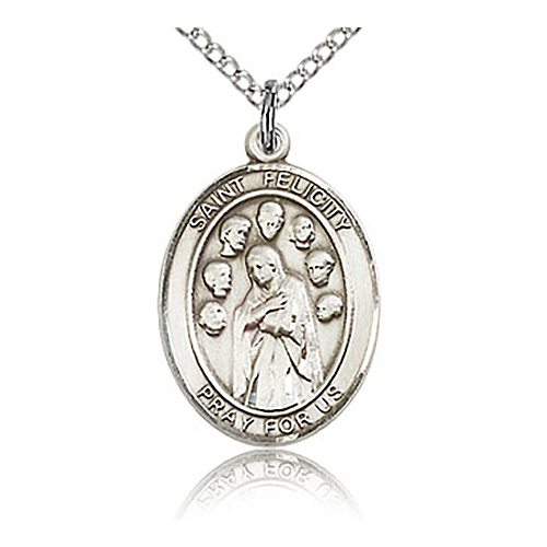 This silver Saint Felicity medal is a die struck, hand-engraved medal. Inscription: SAINT FELICITY PRAY FOR US. 18-inch sterling silver lite curb chain with lobster clasp. Dimensions: 3/4in x 1/2in. This item is the size of a penny. Made in USA.