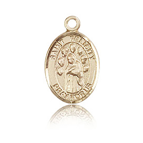 Die struck, hand-engraved medal is made of polished, solid 14kt yellow gold. Inscription: SAINT FELICITY PRAY FOR US. Dimensions: 1/2in x 1/4in. This item is half the height of a quarter. Made in USA.