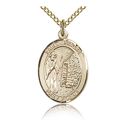 St Fiacre medal is made of gold-filled sterling silver dangles from a gold-plated sterling silver 18in lite curb chain with lobster clasp. Dimensions: 3/4in x 1/2in. This item is the size of a penny. Inscription: SAINT FIACRE PRAY FOR US. Die struck, hand-engraved. Made in USA.