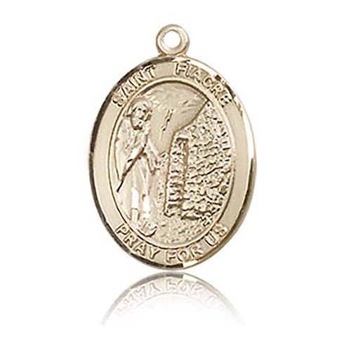 This ladies' 14k yellow gold oval St Fiacre medal is die struck and hand-engraved. Inscription: SAINT FIACRE PRAY FOR US. Dimensions: 3/4in x 1/2in. This item is the size of a penny. Made in USA.