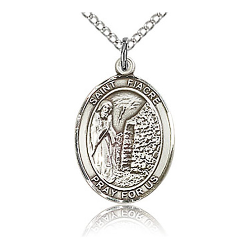 Sterling silver oval St Fiacre medal has the inscription: SAINT FIACRE PRAY FOR US. 18-inch sterling silver lite curb chain with lobster clasp. Dimensions: 3/4in x 1/2in. This item is the size of a penny. Die struck, hand-engraved. Made in USA.
