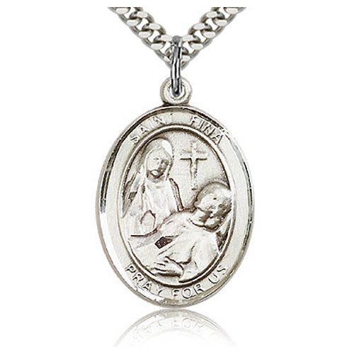 Die struck, hand-engraved medal. Inscription: SAINT FINA PRAY FOR US. Free 24-inch stainless steel, endless heavy curb chain with silver plating. Dimensions: 1in x 3/4in. This item is the size of a quarter. Made in USA.