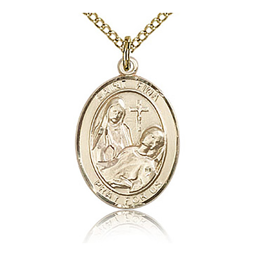 This plated St. Fina medal is a die struck, hand-engraved medal. Inscription: SAINT FINA PRAY FOR US. 18-inch gold-plated sterling silver lite curb chain has a lobster clasp. Dimensions: 3/4in x 1/2in. This item is the size of a penny. Made in USA.