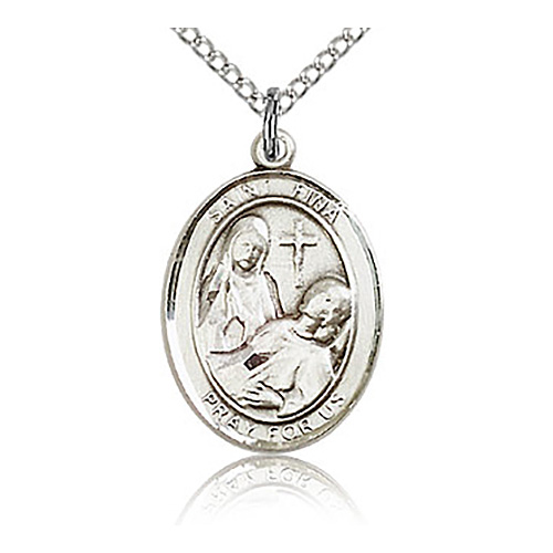 This silver St. Find medal is a die struck, hand-engraved medal. Inscription: SAINT FINA PRAY FOR US. Free 18-inch sterling silver lite curb chain with lobster clasp. Dimensions: 3/4in x 1/2in. This item is the size of a penny. Made in USA.
