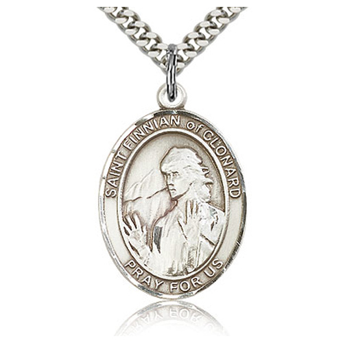 This men's St Finnian medal is made of solid sterling silver. Die struck, hand-engraved. Inscription: SAINT FINNIAN PRAY FOR US. 24-inch stainless steel, endless heavy curb chain with silver plating. Dimensions: 1in x 3/4in. This item is the size of a quarter. Made in USA.