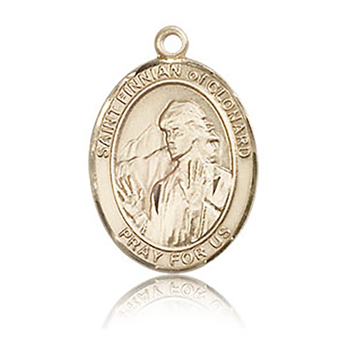 Die struck, hand-engraved medal is made of polished, solid 14kt yellow gold. Inscription: SAINT FINNIAN PRAY FOR US. Dimensions: 3/4in x 1/2in. This item is the size of a penny. Made in USA.