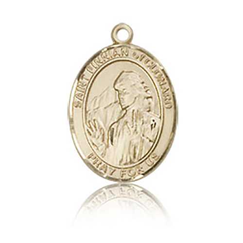 This very small St Finnian medal is made of solid 14k yellow gold. Inscription: SAINT FINNIAN PRAY FOR US. Dimensions: 1/2in x 1/4in. This item is half the height of a quarter. Die struck, hand-engraved. Made in USA.