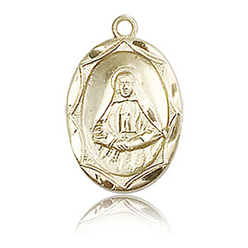 Die struck, hand-engraved St Frances Cabrini medal is made of polished, solid 14kt yellow gold. Dimensions: 5/8in x 3/8in. This item is the size of a penny. Made in USA.