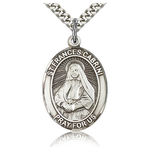 This men's stelrling silver St Frances Cabrini necklace is die struck, and hand engraved. Inscription: SAINT FRANCES CABRINI PRAY FOR US. 24-inch stainless steel, endless heavy curb chain with silver plating. Dimensions: 1in x 3/4in. This item is the size of a quarter. Made in USA.