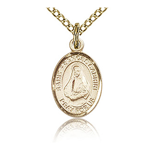This very small oval St Frances Cabrini charm is made of gold filled sterling silver. Plain back. Dimensions: 1/2in x 1/4in. This item is half the height of a quarter. 18-inch gold plated, sterling silver lite curb chain with lobster clasp. Die struck, hand-engraved. Made in USA.