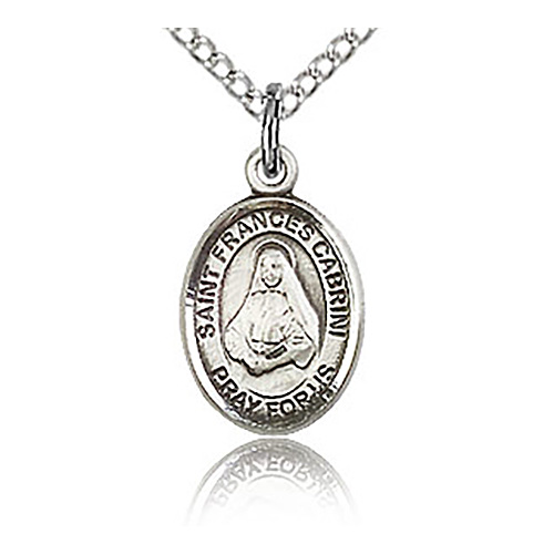Die struck, hand-engraved St Frances Cabrini charm. Free 18-inch sterling silver lite curb chain with lobster clasp. Plain back. Dimensions: 1/2in x 1/4in. This item is half the height of a quarter. Made in USA.