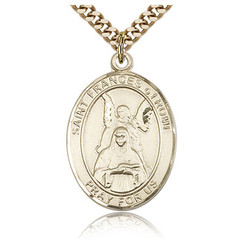 This men's oval St Frances of Rome medal is made of gold filled sterling silver. Die struck, hand-engraved. Inscription: SAINT FRANCES of ROME PRAY FOR US. 24-inch stainless steel, endless heavy curb chain with gold plating. Dimensions: 1in x 3/4in. This item is the size of a quarter. Made in USA.