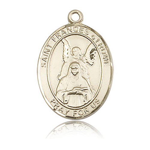 Die struck, hand-engraved St Frances of Rome medal is made of polished, solid 14k yellow gold. Inscription: SAINT FRANCES of ROME PRAY FOR US. Dimensions: 1in x 3/4in. This item is the size of a quarter. Made in USA.