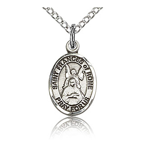 This small St Frances of Rome charm is made of sterling silver. 18-inch sterling silver lite curb chain with lobster clasp. Plain back. Dimensions: 1/2in x 1/4in. This item is half the size of a quarter. Die struck, hand-engraved. Made in USA.