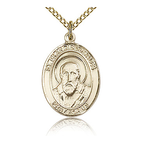 This ladies' St Francis de Sales medal is made of gold filled sterling silver. Die struck, hand-engraved medal. Inscription: SAINT FRANCIS de SALES PRAY FOR US. 18-inch gold-plated sterling silver lite curb chain with lobster clasp. Dimensions: 3/4in x 1/2in. This item is the size of a penny. Made in USA.
