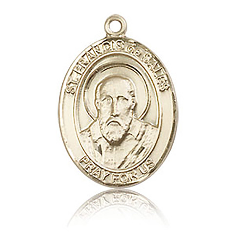 Die struck, hand-engraved St. Francis de Sales medal is made of polished, solid 14k yellow gold. Inscription: SAINT FRANCIS de SALES PRAY FOR US. Dimensions: 3/4in x 1/2in. This item is the size of a penny. Made in USA.