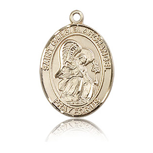 Die struck, hand-engraved st. Gabriel medal is made of polished solid 14k yellow gold. Inscription: SAINT GABRIEL ARCHANGEL PRAY FOR US. Dimensions: 3/4in x 1/2in. This item is the size of a penny. Made in USA.