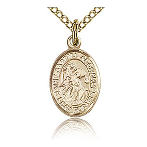 This very small oval St Gabriel the Archangel charm is made of gold filled sterling silver. 18-inch gold plated, sterling silver lite curb chain with lobster clasp. Plain back. Dimensions: 1/2in x 1/4in. This item is half the height of a quarter. Made in USA.