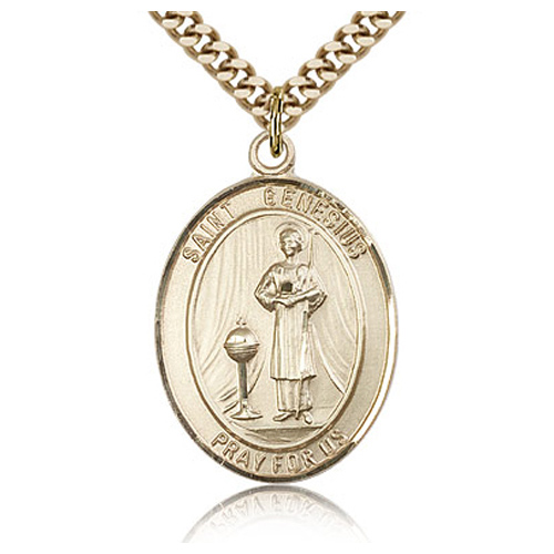 This men's oval St Genesius medal is made of gold filled sterling silver. Die struck, hand-engraved. Inscription: SAINT GENESIUS PRAY FOR US. 24-inch stainless steel, endless heavy curb chain with gold plating. Dimensions: 1in x 3/4in. This item is the size of a quarter. Made in USA.