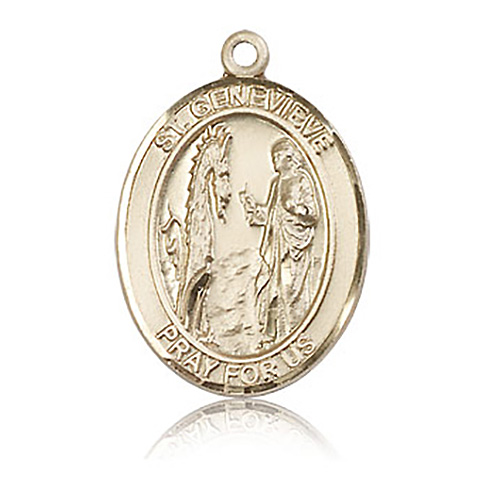 Die struck, hand-engraved St Genevieve medal is made of polished, solid 14k yellow gold. Inscription: SAINT GENEVIEVE PRAY FOR US. Dimensions: 1in x 3/4in. This item is the size of a quarter. Made in USA.
