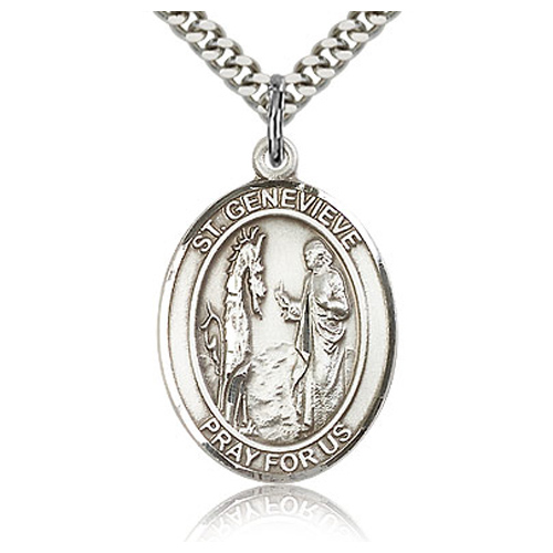 Die struck, hand-engraved oval St Genevieve medal is made of sterling silver. Inscription: SAINT GENEVIEVE PRAY FOR US. Dimensions: 1in x 3/4in. This item is the size of a quarter. Free 24-inch stainless steel, endless heavy curb chain with silver plating. Made in USA.