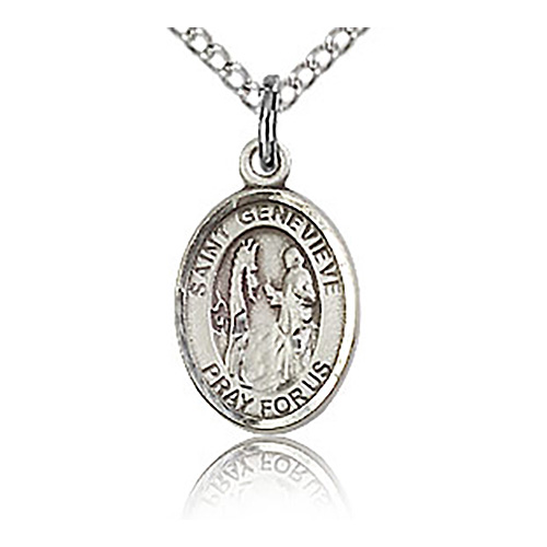This small oval St Genevieve charm is made of sterling silver. 18-inch sterling silver lite curb chain with lobster clasp. Dimensions: 1/2in x 1/4in. Plain back. This item is half the height of a quarter. Die struck hand-engraved. Made in USA.