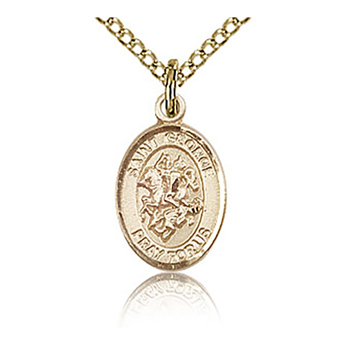 Die struck, hand-engraved St George charm is made of gold filled sterling silver. 18-inch gold plated, sterling silver lite curb chain with lobster clasp. Plain back. Dimensions: 1/2in x 1/4in. This item is half the height of a quarter. Made in USA.