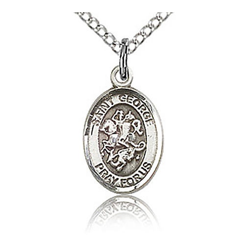 Die struck, hand-engraved St George charm. Free 18-inch sterling silver lite curb chain with lobster clasp. Plain back. Dimensions: 1/2in x 1/4in. This item is half the size of a quarter. Made in USA.