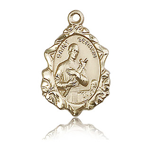 St Gerard shield medal is made of polished, solid 14k yellow gold. Inscription: SAINT GERARD. Dimensions: 3/4in x 1/2in. This item is the size of a penny. Made in USA.