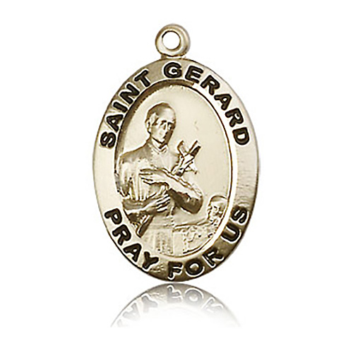 Die struck hand-engraved St Gerard medal is made of polished, solid 14k yellow gold. Inscription: SAINT GERARD PRAY FOR US. Dimensions: 1in x 5/8in. This item is the size of a quarter. Made in USA.