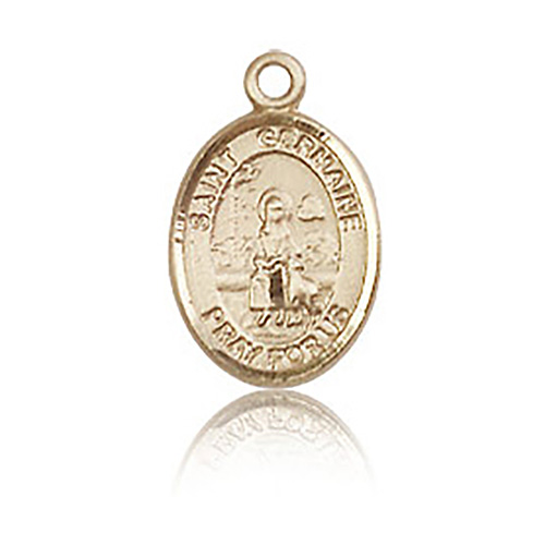 This very small hand-engraved St Germain Cousin medal is made of solid 14k yellow gold. Inscription: SAINT GERMAIN PRAY FOR US. Dimensions: 1/2in x 1/4in. This item is half the height of a quarter. Made in USA.